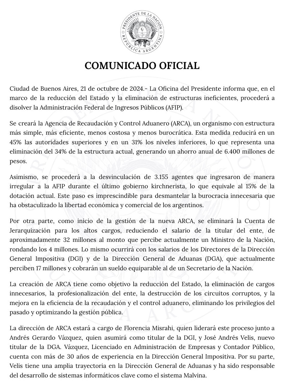 La Oficina del Presidente de la Nación anunció la disolución de la Administración Federal de Ingresos Públicos (AFIP) como parte de una estrategia para reducir el Estado y eliminar estructuras consideradas ineficientes. En su lugar, se creará la Agencia de Recaudación y Control Aduanero (ARCA), un organismo más simple y menos burocrático. Esta reestructuración busca reducir en un 45% los niveles superiores y en un 31% los inferiores, eliminando el 34% de la estructura actual. El ahorro anual estimado es de 6.400 millones de pesos.