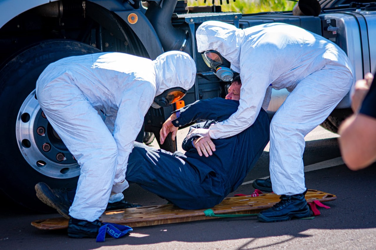 Este viernes, la Policía de Misiones, en conjunto con los Bomberos, el Ministerio de Salud, Prefectura y Gendarmería llevaron adelante el simulacro de un siniestro vial con derramamiento de sustancias peligrosas y la evacuación de heridos, sobre el acceso del puente de Garupá.