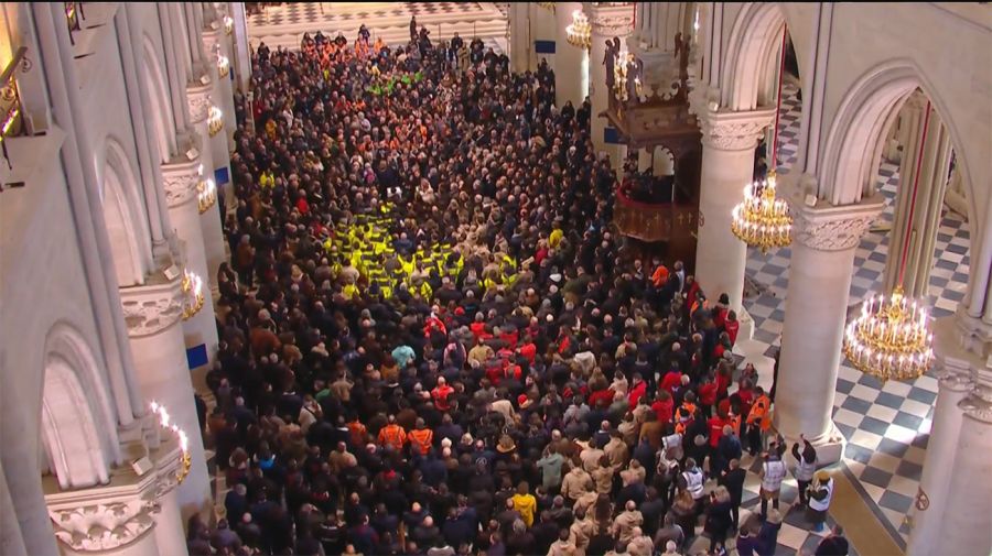 Las gigantescas puertas frontales fueron testigos del asombro del mandatario francés al observar los resultados. Unos 1.300 invitados asistieron al evento oficial, donde se rindió homenaje a los artesanos que participaron en la reconstrucción de la catedral tras el incendio del 15 de abril de 2019.