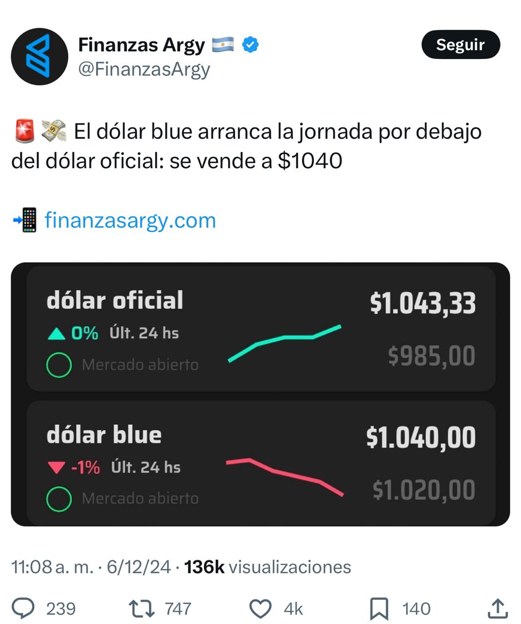 En un giro inesperado en el mercado cambiario argentino, el dólar blue ha amanecido más barato que el dólar oficial. Según datos recientes, el dólar blue cotiza a $1040, mientras que el dólar oficial se mantiene en $1043,33.