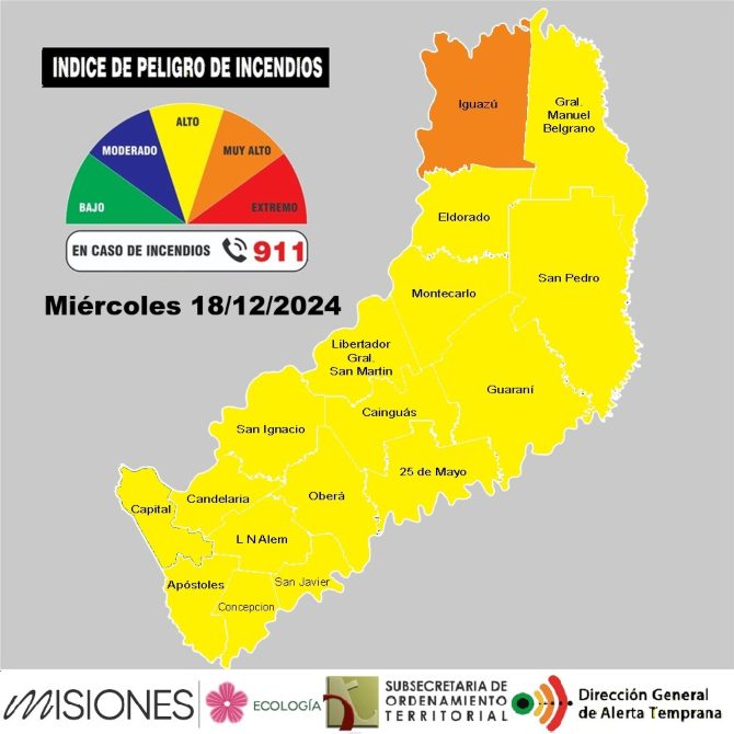 – Iguazú: Es el único departamento que registra un índice de peligro alto, con condiciones climáticas que incrementan la posibilidad de focos de incendio. La falta de lluvias y el aumento de las temperaturas contribuyen al escenario adverso.
