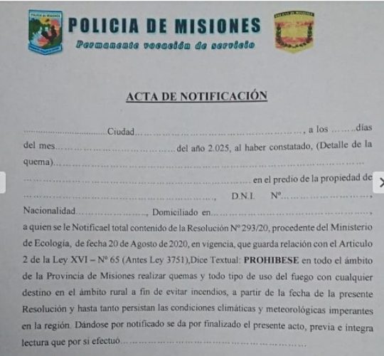 Una vez indentificado el autor de la quema, la Policía le notifica infracción a la resolución 293/20 del Ministerio de Ecología. El documento establece la prohibición de quemas y “todo uso de fuego” en la Provincia.