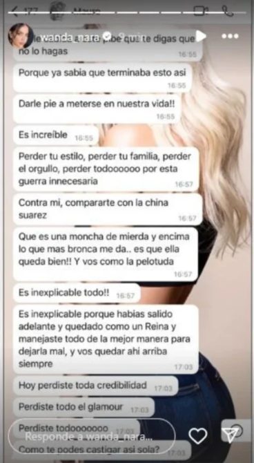 En las capturas de pantalla que difundió la misma Wanda, Icardi le reclama que la guerra mediática que estaba generando la está haciendo quedar mal; perdiendo su familia, estilo y “glamour”.