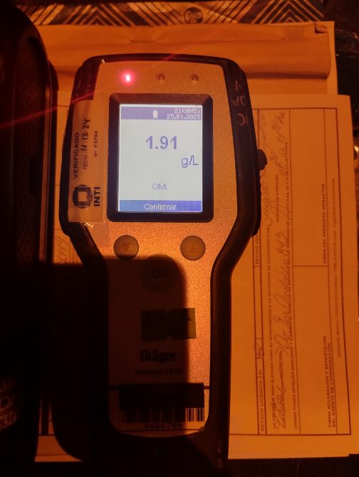 En un operativo de control vehicular realizado en la noche de ayer en Aristóbulo del Valle, una mujer de 26 años fue detenida por conducir bajo los efectos del alcohol, poniendo en peligro su vida y la de peatones, como también de otros conductores. Tras someterse al test de alcoholemia, la mujer arrojó un resultado de 1,91 gramos de alcohol en sangre, lo que derivó en su arresto y posterior traslado a la comisaría.