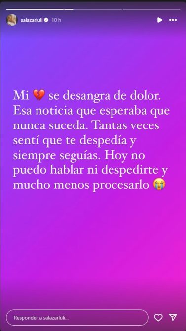 Su amistad con Luciana Salazar fue uno de los pilares de su vida. Al enterarse de su muerte, la modelo expresó su dolor a través de un mensaje en sus historias de Instagram: “Mi corazón se desangra de dolor. Esa noticia que esperaba que nunca suceda. Hoy no puedo hablar ni despedirte y mucho menos procesarlo”. Luciana, quien fue una de las más cercanas a Sandra, compartió su angustia junto a otros amigos y colegas del espectáculo.