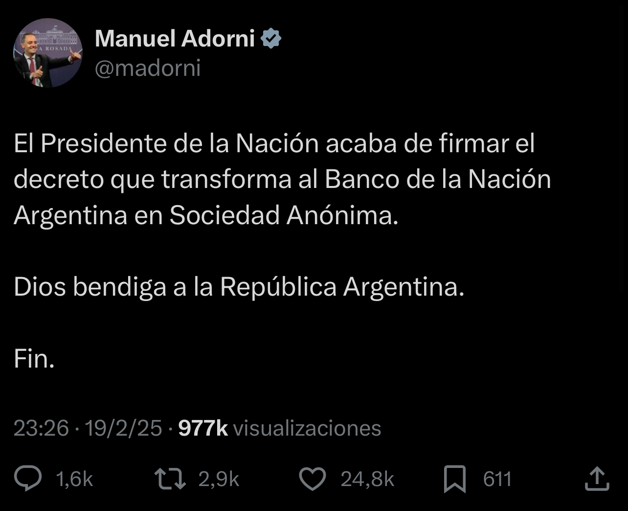 El presidente Javier Milei firmó un decreto que convierte al Banco de la Nación Argentina en una sociedad anónima (BNA S.A.), con el objetivo de modernizar su estructura y permitir la incorporación de capital privado. La medida fue oficializada en el Boletín Oficial y anunciada por el vocero presidencial, Manuel Adorni, quien expresó: “El Presidente de la Nación acaba de firmar el decreto que transforma al Banco de la Nación Argentina en Sociedad Anónima. Dios bendiga a la República Argentina. Fin”.