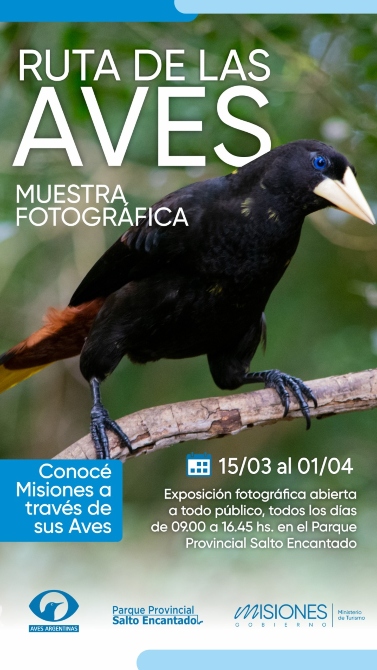 Este sábado 15 de marzo, se abre la exposición “Ruta de las Aves” que invita a apreciar la riqueza de la avifauna misionera. La exhibición estará abierta al público hasta el 1 de abril, en el Parque Provincial Salto Encantado, de 9 a 16.45 hs.