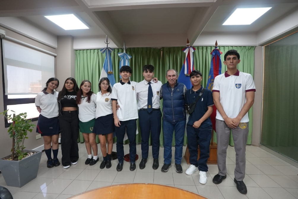 La delegación estudiantil estuvo acompañada por el equipo de la Dirección de Políticas Estudiantiles del Ministerio de Educación, en un encuentro que también contó con la participación de la Secretaria de Educación y Cultura de la Municipalidad, Lic. Mariela Dachary, el Secretario de Gobierno, Lic. José Amable, y el diputado provincial Rudi Bundziak.