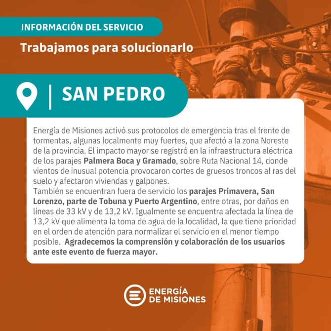 Energía de Misiones activó sus protocolos de emergencia tras el frente de tormentas, algunas localmente muy fuertes, que afectó en la noche del domingo a la zona Noreste de la provincia. El impacto mayor se registró en la infraestructura eléctrica de los parajes Palmera Boca y Gramado, sobre Ruta Nacional 14, donde vientos de inusual potencia provocaron cortes de gruesos troncos al ras del suelo y afectaron viviendas y galpones.
