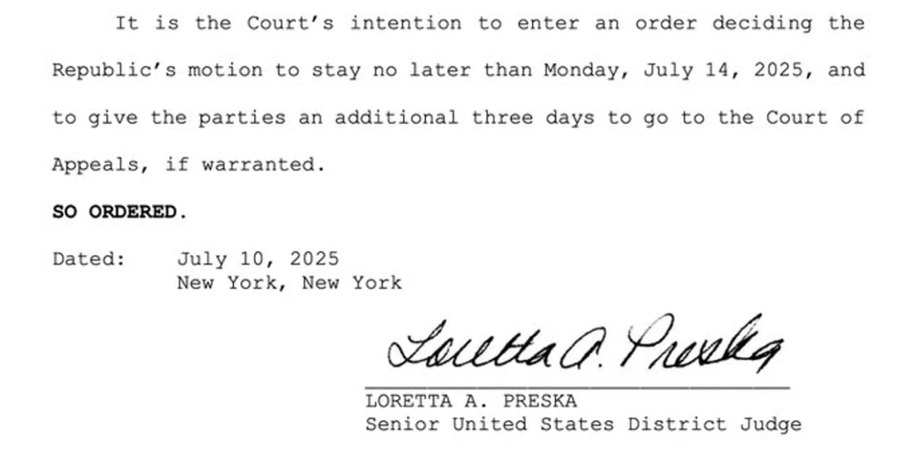 La justicia de Nueva York, a cargo de la jueza Loretta Preska, decidirá este lunes 14 de julio si acepta la apelación presentada por Argentina para suspender la sentencia que le obliga a ceder el 51% de las acciones de YPF a fondos buitres que demandaron al país por la expropiación de la petrolera. La noticia fue confirmada esta noche por Sebastián Maril, experto en el caso que se sigue en los tribunales neoyorquinos.