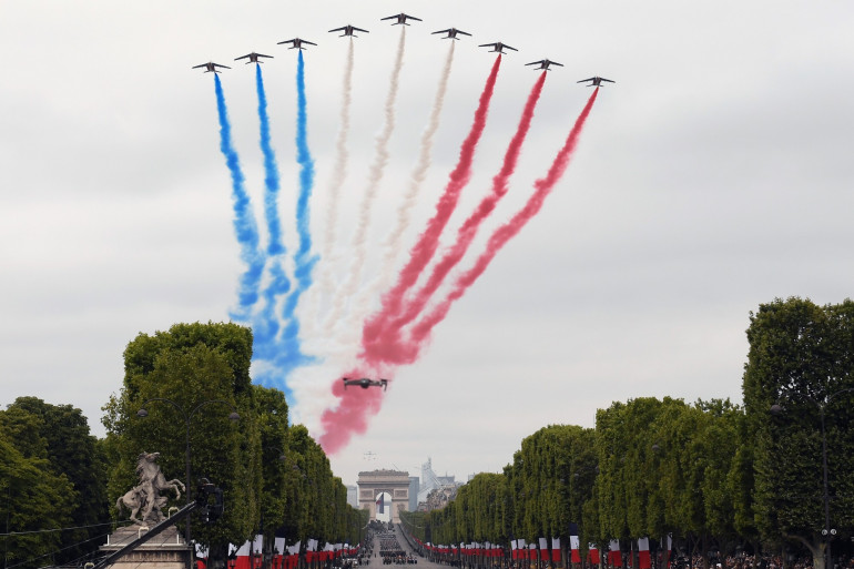 Desde las 10:00 (hora local), los aviones de la Patrouille de France abrieron el desfile aéreo con ocho Alphajet —uno menos de lo habitual, por un accidente ocurrido en marzo— dibujando el tricolor francés en el cielo de París. Le siguieron más de 60 aviones y 30 helicópteros de las distintas ramas del Ejército, la Gendarmería, la Marina y los servicios civiles.
