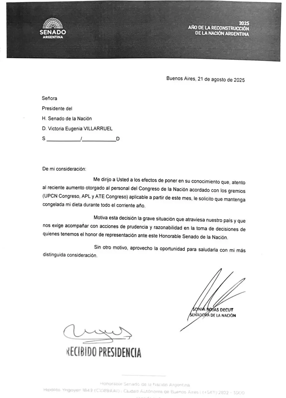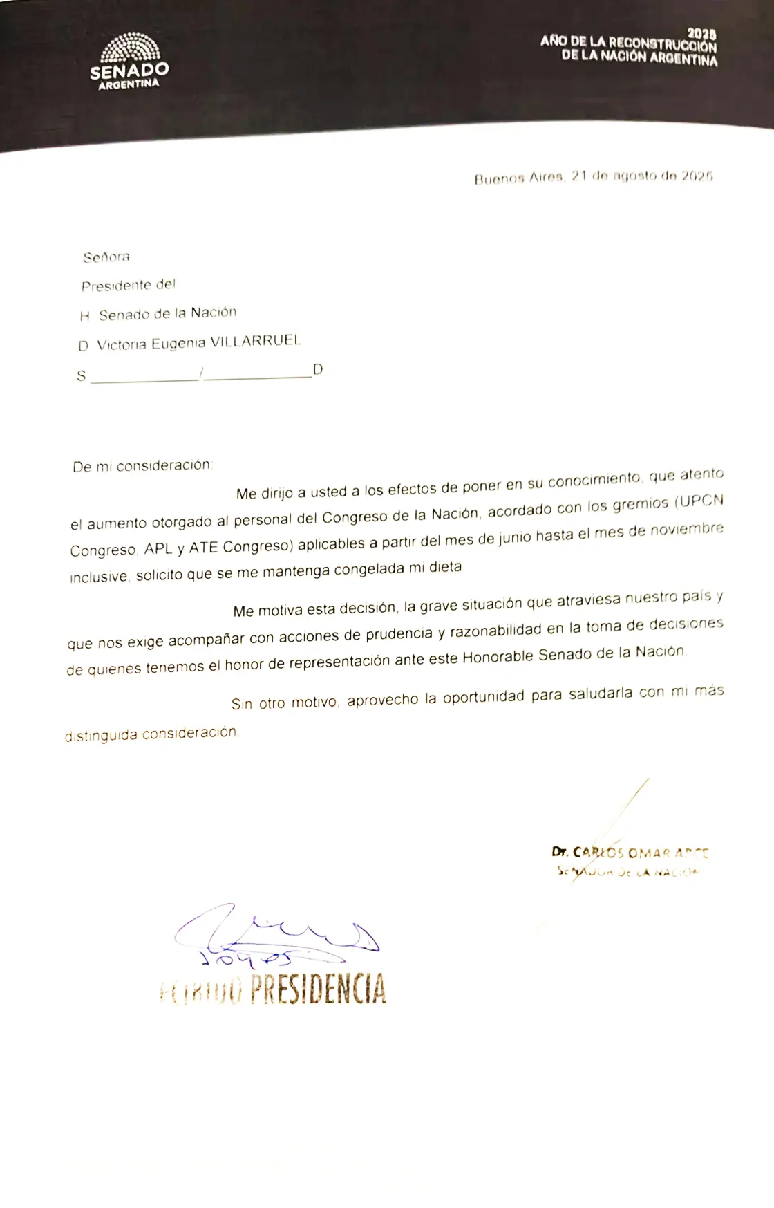 En una nota dirigida a la presidencia del Senado, a cargo de Victoria Villarruel, los senadores explicaron que, pese a que los incrementos salariales son aplicables a partir de este mes, solicitan que se mantenga congelada su dieta durante todo el corriente año.