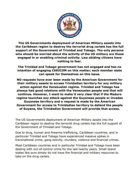Asimismo, el gobierno subrayó que Estados Unidos nunca solicitó utilizar territorio trinitense para operaciones militares contra Venezuela, y remarcó que las relaciones con el pueblo venezolano siempre han sido buenas. Sin embargo, se dejó en claro que si el régimen de Nicolás Maduro atacara a Guyana o invadiera su territorio, Trinidad y Tobago concedería a las fuerzas estadounidenses el uso de su territorio para defender al pueblo guyanés, en caso de que así se solicitara.