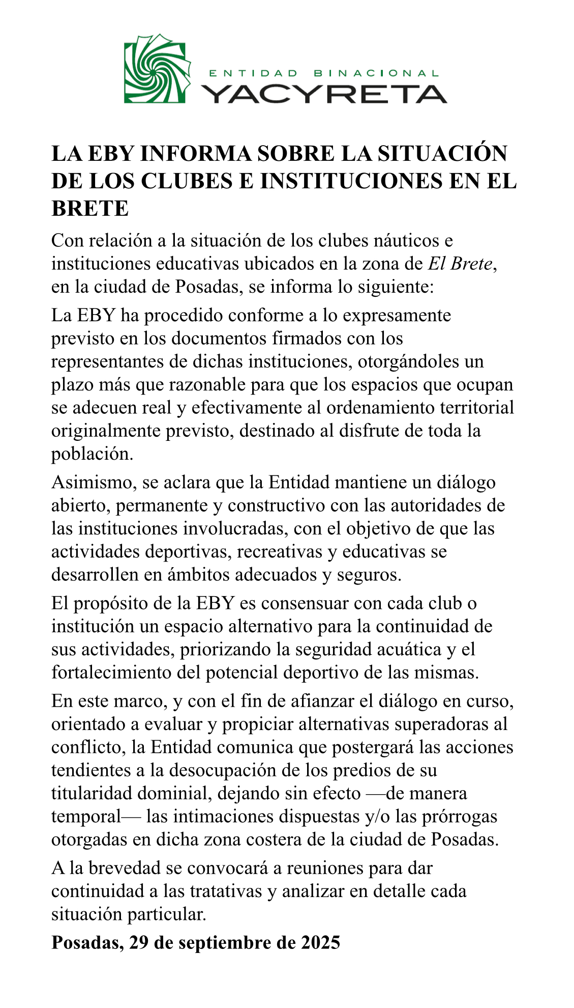 En un comunicado oficial, la EBY sostuvo que la decisión de frenar los desalojos busca “afianzar el diálogo en curso, orientado a evaluar y propiciar alternativas superadoras al conflicto”. Desde la entidad adelantaron que en los próximos días se realizarán reuniones individuales con cada institución afectada para consensuar soluciones.
