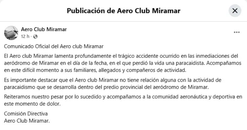 Horas después de la tragedia, el aeroclub emitió un comunicado a través de sus redes sociales donde lamentó el accidente y se desligó de la actividad de paracaidismo que se desarrollaba en el predio.