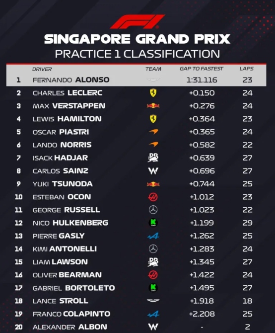 El piloto argentino, que este fin de semana competirá en la decimoctava carrera de la F1, tuvo su mejor tiempo en 1:33.324 a lo largo de las 26 vueltas que sumó en Marina Bay. En cuanto al resto de los corredores, Fernando Alonso sorprendió a todos en el callejero y fue el más rápido de la tanda con 1:31.116 a bordo de su Aston Martin, seguido por Charles Leclerc (1:31.266) y Max Verstappen (1:31.392).