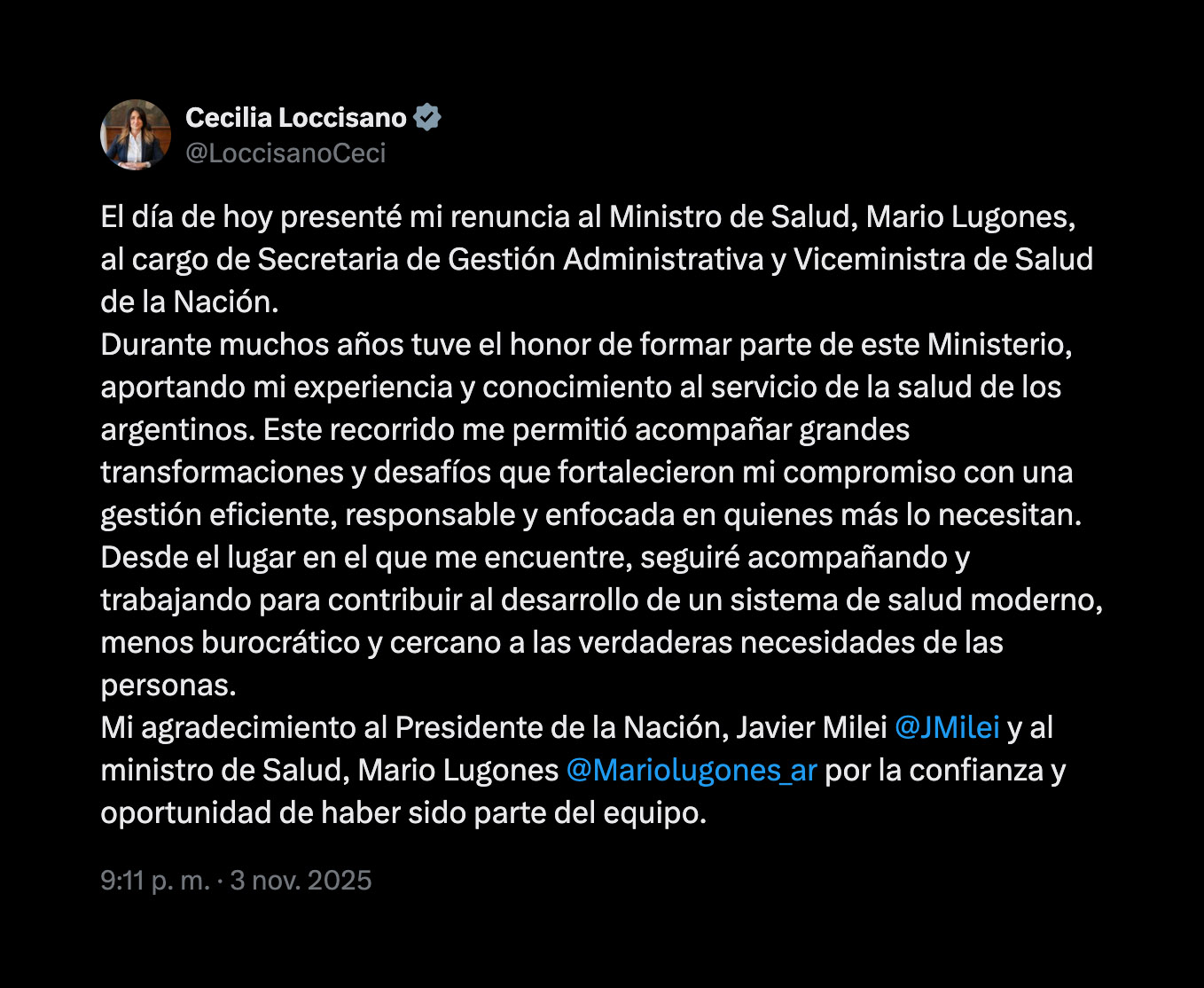 “El día de hoy presenté mi renuncia al ministro de Salud, Mario Lugones, al cargo de Secretaria de Gestión Administrativa y Viceministra de Salud de la Nación.”