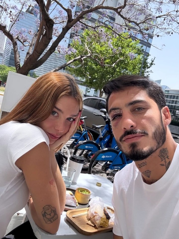 El central compartió este martes una postal relajada: vestido de blanco, disfrutando de un almuerzo al aire libre y todavía con las marcas del corte que sufrió ante Tigre. A su lado, Lucía, con la misma remera blanca y gesto cómplice.