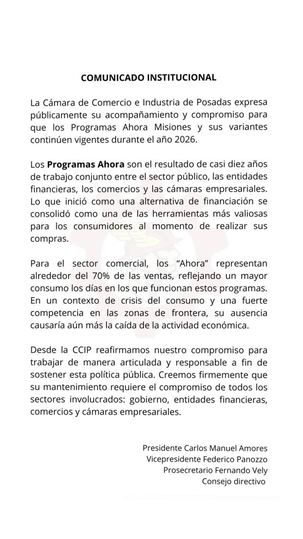 La Cámara de Comercio e Industria de Posadas (CCIP) emitió un comunicado institucional en el que solicita que los Programas Ahora Misiones y sus variantes continúen aplicándose durante todo 2026. La entidad destacó que estas herramientas, vigentes hace casi una década, se consolidaron como un mecanismo central para sostener el consumo en la provincia y para mantener competitividad frente a la presión comercial de las zonas de frontera.